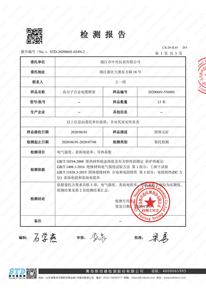 资质证书 Qualification certificate高分子合金电缆桥架检测报告 STD-20200601-034N-2